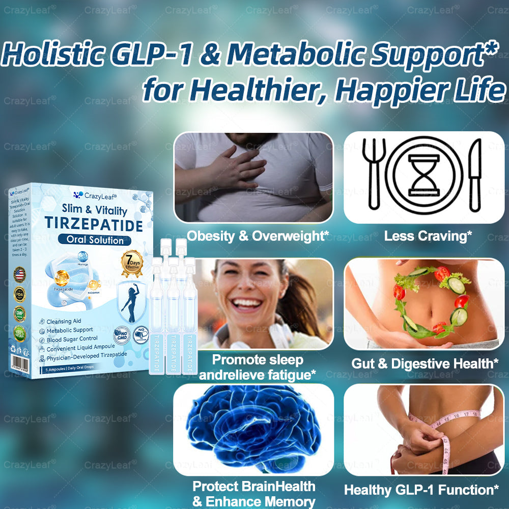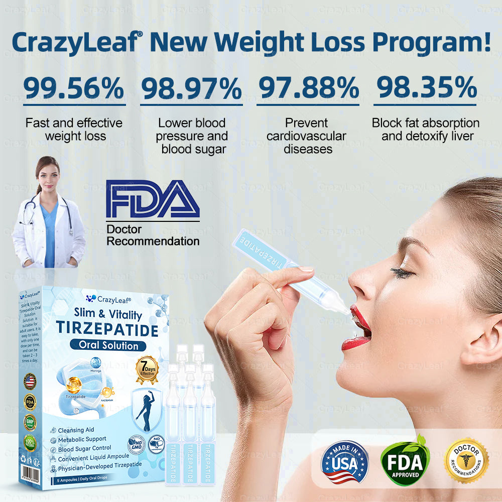 CrazyLeafยฎ Slim and Vitality Tirzepatide Oral Solutionย This cutting-edge product was designed by a team of leading experts in obesity managementย who have conducted years of in-depth research to fully understand the mechanisms of weight loss and obesity control. Combining Teicoplanin with potent herbal ingredients boosts metabolism, accelerates fat burning, and aids in digestive and lymphatic health. FDA-approved for safety and efficacy, this Oral Liquid offers a science-backed solution for weight loss and overall well-being.